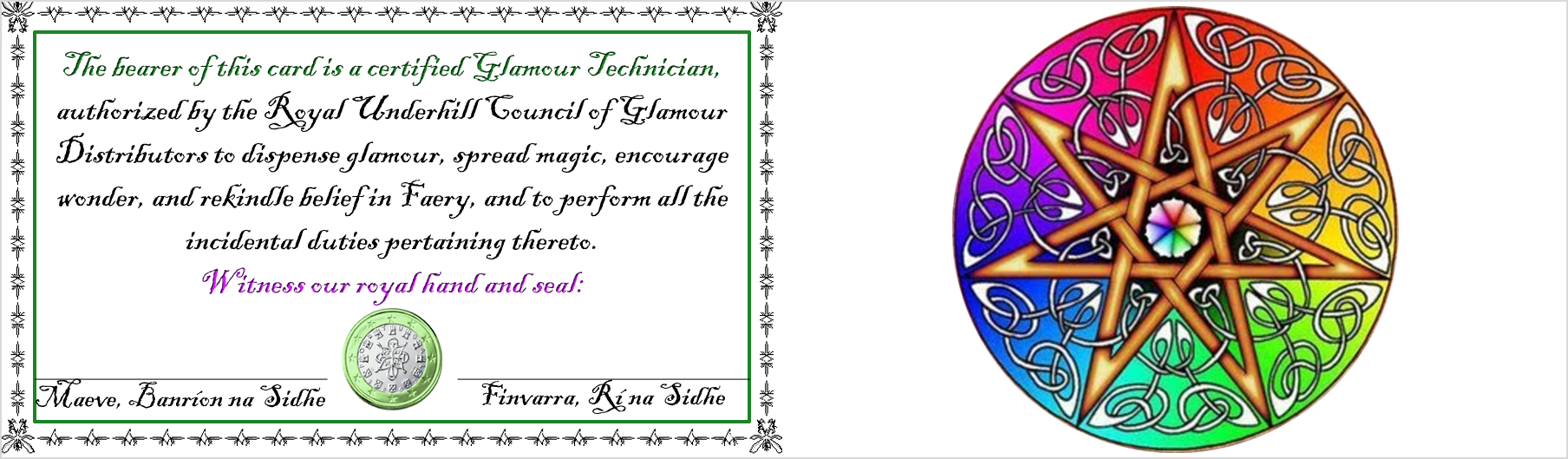 The text reads: The bearer of this card is a certified Glamour Technician, authorized by the Royal Underhill Council of Glamour Distributors to dispense glamour, spread magic, encourage wonder, rekindle belief in Faery, and to perform all the incidental duties pertaining thereto. Witness our royal hand and seal: Maeve, Banríon na Sidhe; Finvarra, Rí na Sidhe.